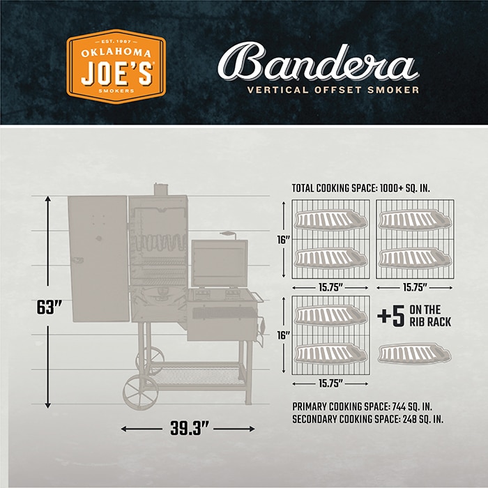 The unique design of the Oklahoma Joe's Bandera Vertical Offset Smoker gives you smoking versatility and maximizes food capacity. The vertical design enables efficient airflow through the smoke chamber. Built with durability in mind, this smoker is constructed with high-temperature, heavy-gauge steel and is equipped with nearly 1,000 sq. in. of smoking and grilling capacity. Included with each smoker: 2 meat hangers, 1 rib rack, 3 cooking grates inside the large cook chamber, and 1 cooking grate in the firebox for optional charcoal grilling.