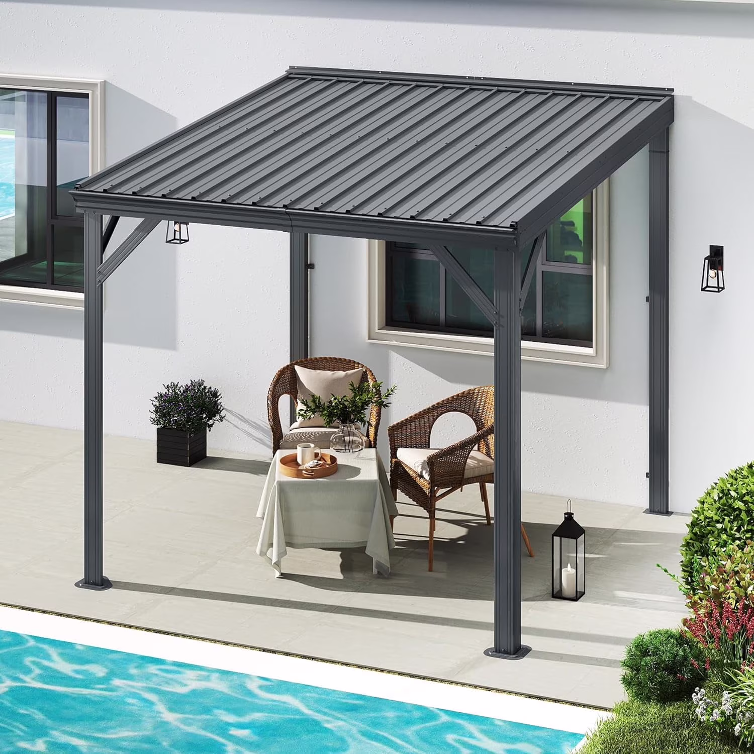 Domi 8x8FT Lean to Gazebo, Outdoor Hardtop Wall Mounted Gazebo with Sloping Galvanized Steel Roof, Upgraded Heavy Duty Mounted Shelter with Drainage System for Deck, Porch, Backyard