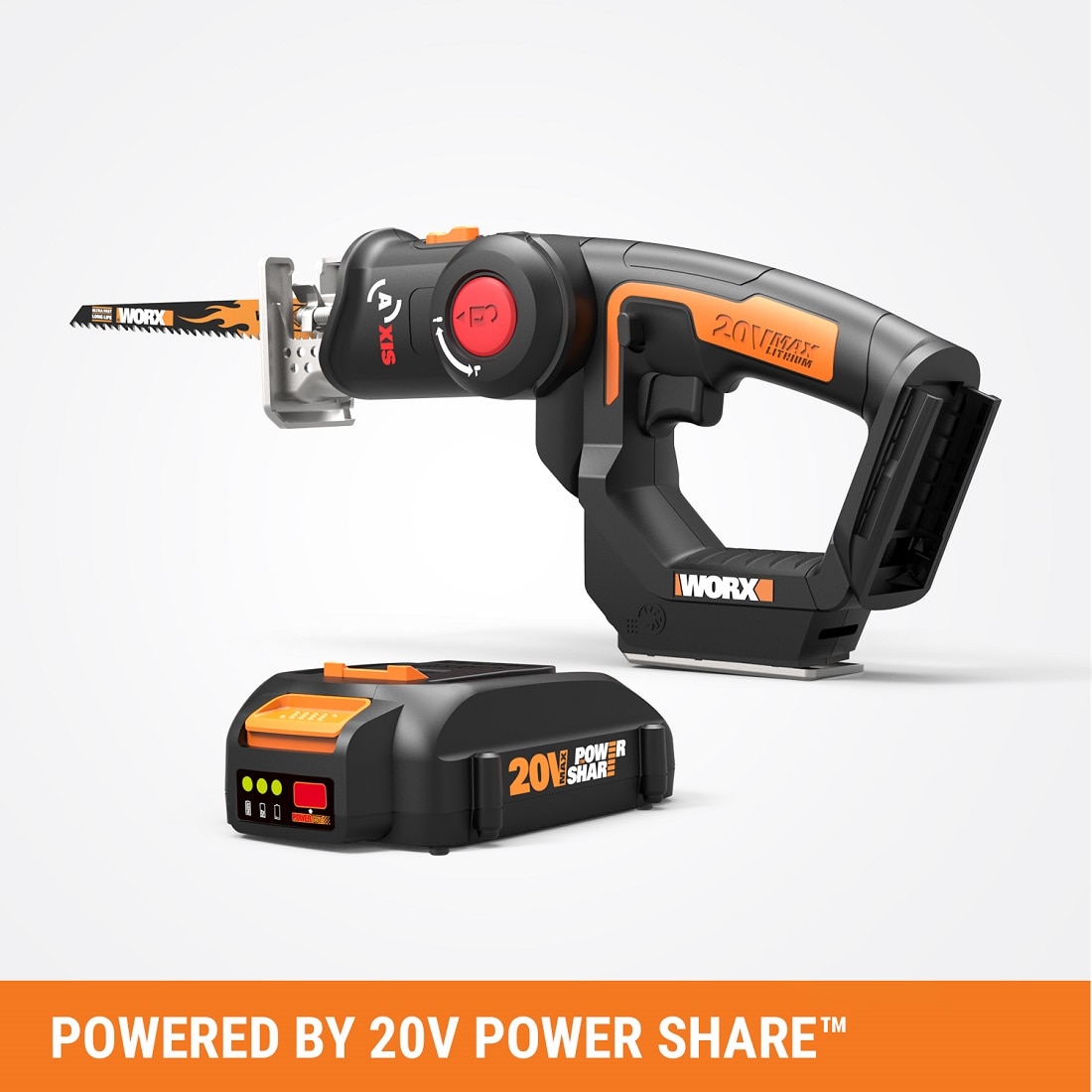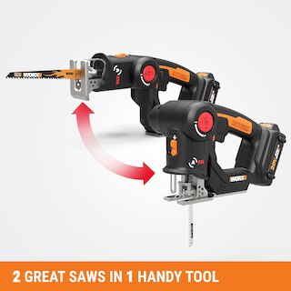 This 20V Axis Reciprocating/Jig Saw 2-in-1 gives you a whole lot of tool(s) for the money. There's no need to buy a separate reciprocating saw and jigsaw when you have an Axis. Worx engineers figured out that those two saws actually employ a similar motion to get their different jobs done, and designed a way to put that functionality into one tool. So you get the raw power of a reciprocating saw (3000/min of no-load speed) to tear down structures, but then the head folds down into the base to give you more balance to make those intricate cutouts that only a jigsaw can perform. Plus, there's no cord to get in your way, so you're free to move. And at only 4.2 lbs, you can work long hours without getting hand and arm fatigue. The jigsaw is made to cut through wood (2" cutting capacity), PVC pipe (2"), and steel plate (5/32"). While the reciprocating saw also cuts wood and PVC pipe at 2", but steel pipe at 2", too. And they both have a ?" stroke length. With a built-in dust blower, you'll always see the shapes you're cutting in jigsaw mode. And the safety lock-off switch prevents accidental starting. Get an innovative 20V Axis Reciprocating/Jig Saw 2-in-1 from Worx and get more done, with less strain on both your hands and your wallet.