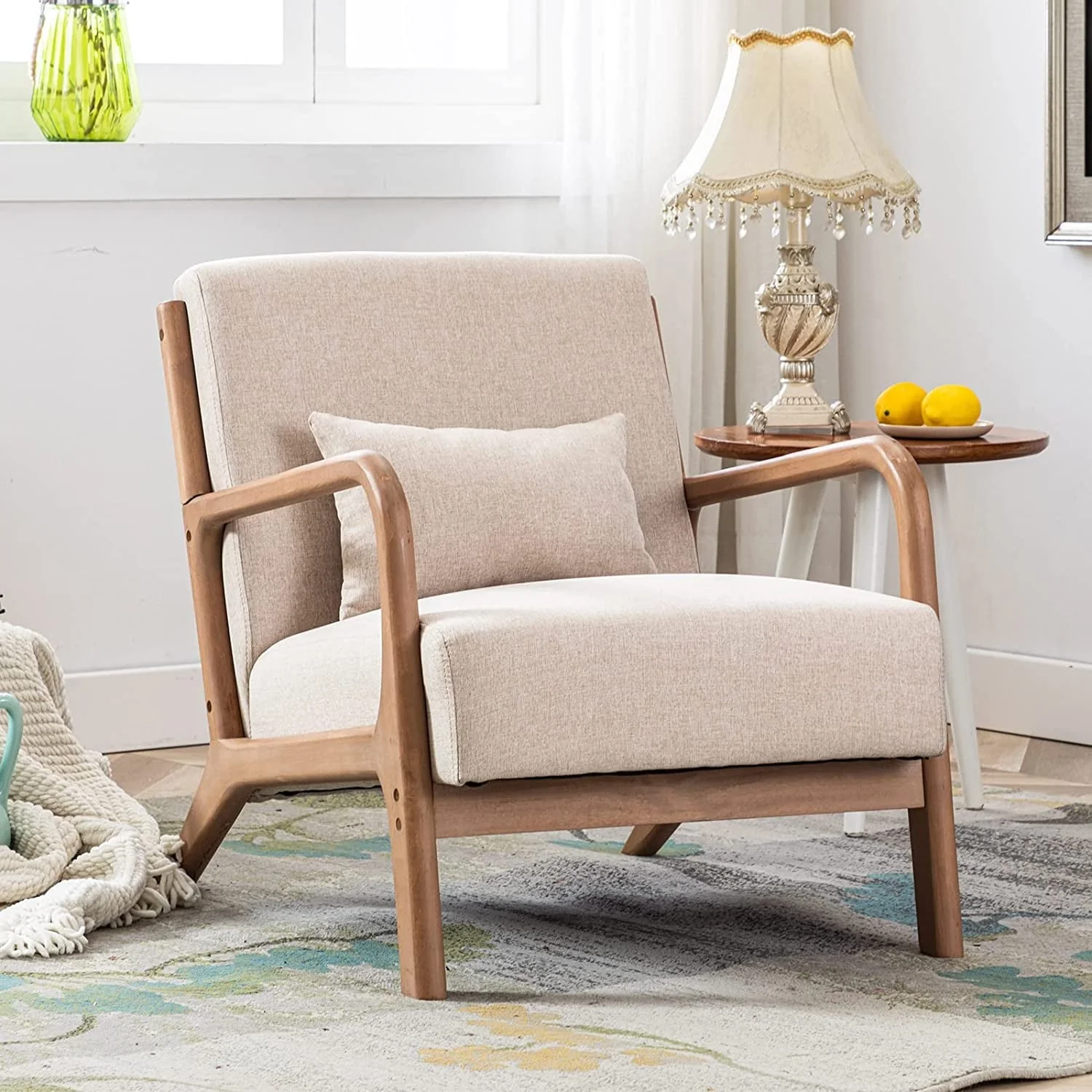 Bonzy Home Mid Century Modern Accent Chair, Single Fabric Lounge Reading Armchair with Solid Wood Frame, Easy Assembly Arm Chairs for Living Room, Beige